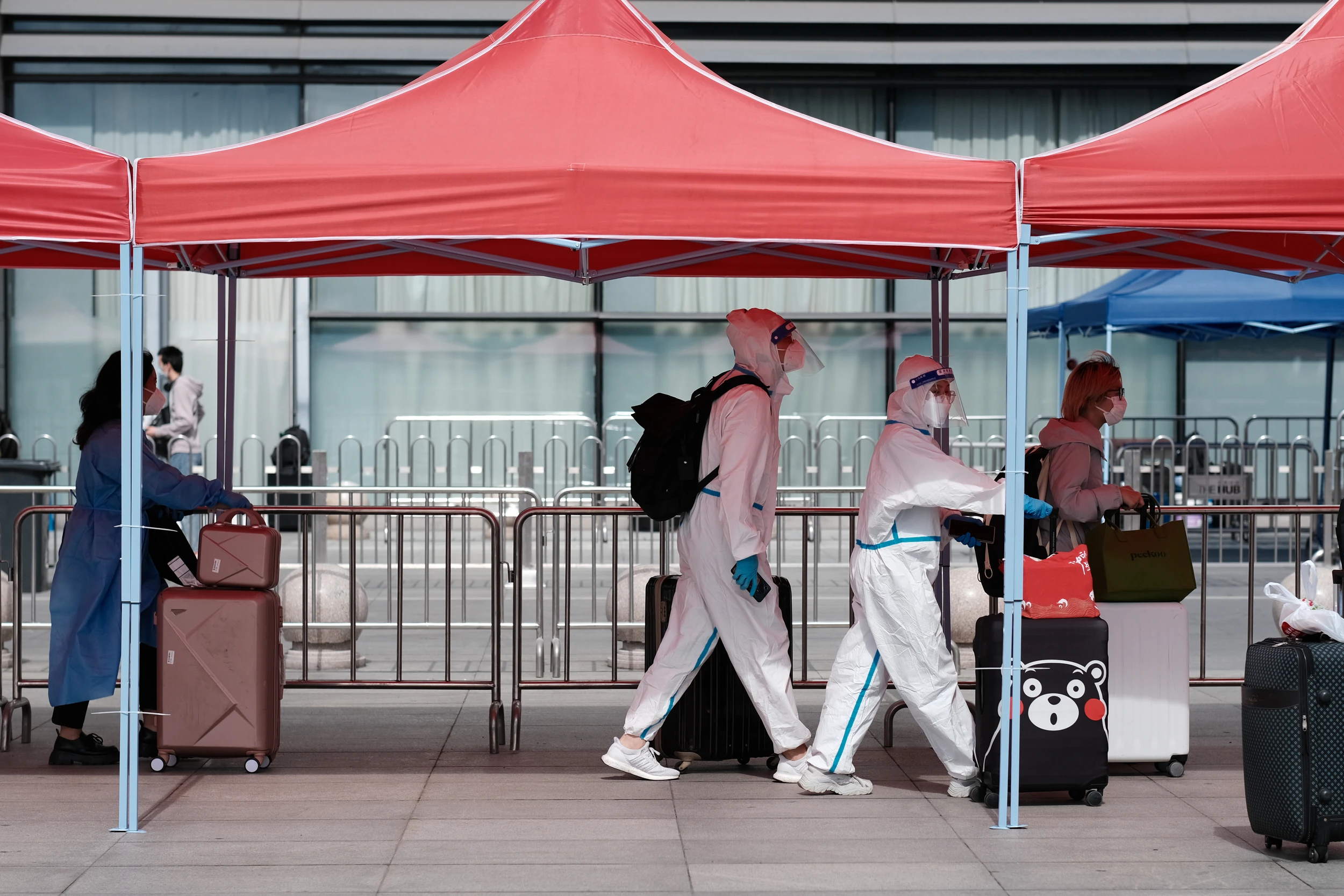 出了站,在进候车厅的队伍旁边,志愿者给每人发了一袋食物。如果没有当日车票,暂时不能进站,需要去滞留乘客集中的一块地方。滞留区入口有辆核酸采样车。有些等待的乘客如果核酸快要过期,可以在这重新检测。