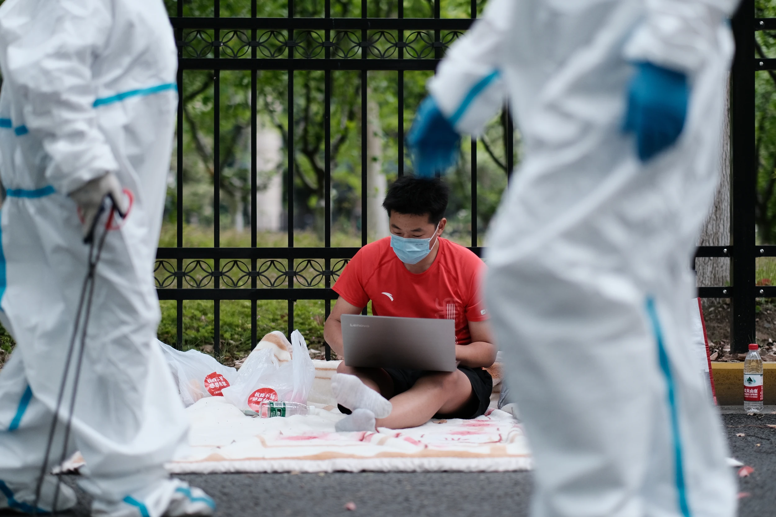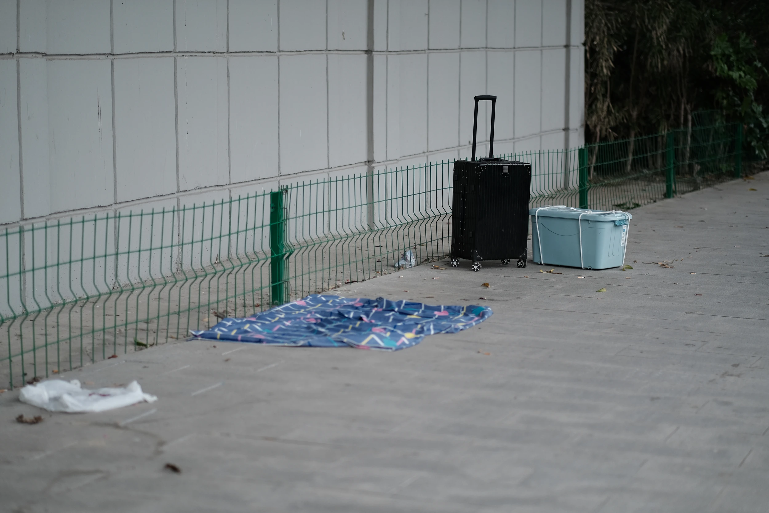 在上海工作的小杨,就带了一个背包和一个纸袋,但准备了一条毯子。他把毯子铺在地上,坐定没一会儿,就拿出来电脑开始工作。