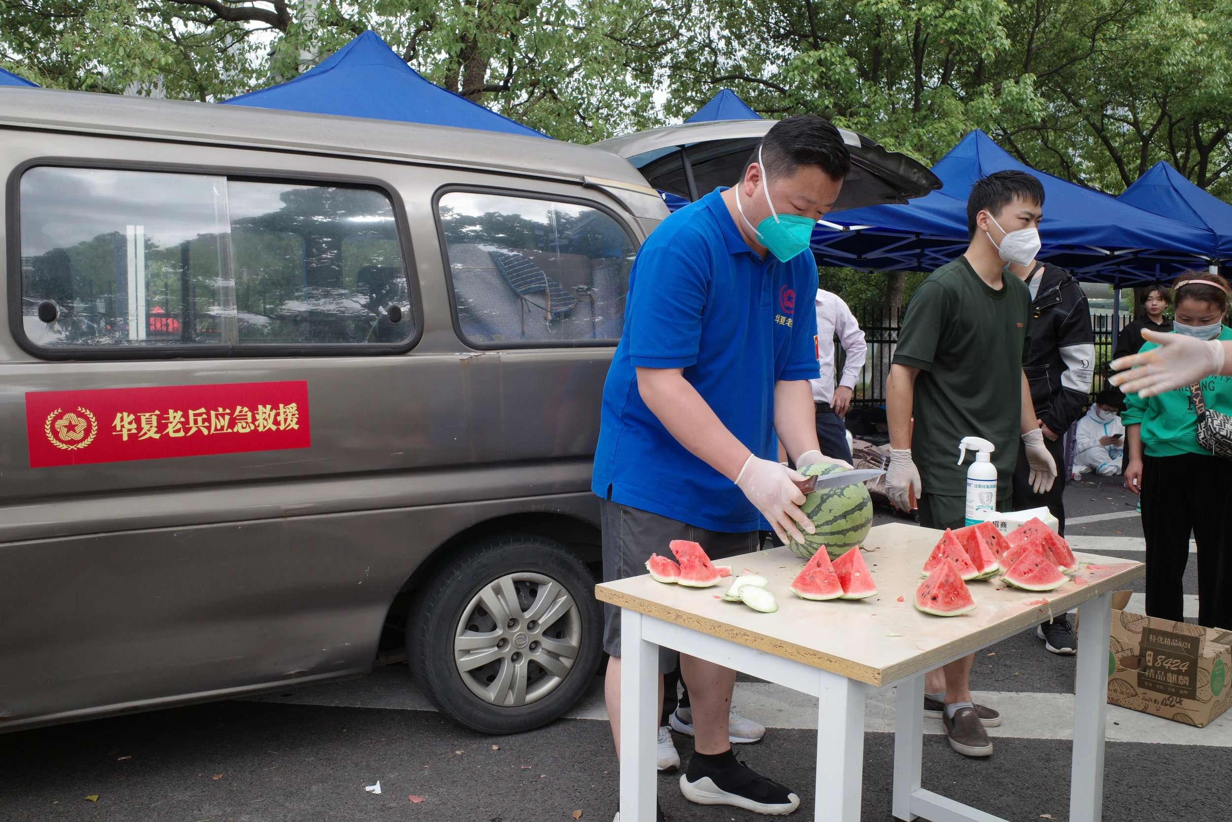 进了滞留区才发现,在这等着明天坐车,或者还没有抢到票的人,仍旧很多。另外还有人叫卖睡袋,50元一个。还有人说,充电30元,可以充到晚上。一辆写着「华夏老兵应急救援」的车,给大家送来了西瓜。🫡